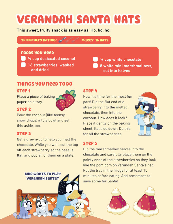 ¡Celebra la Navidad cocinando con Bluey y Bingo!. En este divertido libro descubrirás recetas sencillas y deliciosas para preparar en familia, como tostadas Bartlebee, gorritos de Santa con fresas, galletas de jengibre, cerdo asado crujiente… ¡y muchas más delicias festivas!.